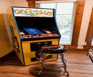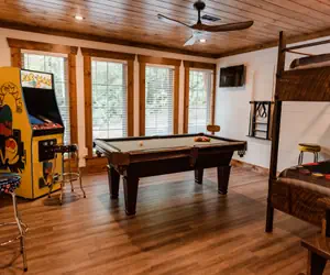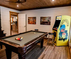 Down the hallway, you will discover the game room, a vibrant, exciting space. Here, you can play a thrilling pool game, testing your skills against friends in a friendly competition. Alternatively, unleash your inner champion and aim for the highest score on the iconic Pac-Man machine, where retro fun awaits. If you're looking for a cozy place to rest afterward, a spacious full-over-full bunk bed is perfect for accommodating extra guests or a comfortable night's sleep.