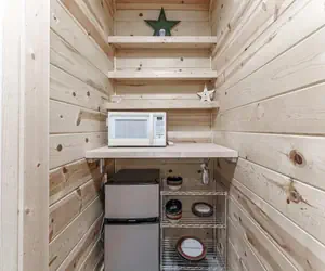 Once you enter the home, you will be impressed with the massive, beautiful staircase that acts as a "tree" leading you to the upper lofted bedroom. There is a Queen bed in the lofted bedroom. This upper level offers a full bath with an amazing deep bathtub to relax, soak, and unwind. There is a sitting area that includes a Queen sleeper sofa to enjoy your favorite movies.