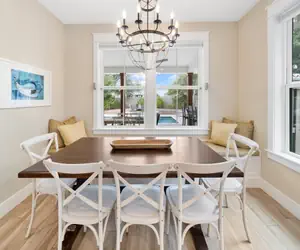 Each furnished living space (both indoor and outdoor) has been well thought out to convey ultimate comfort and convenience for the entire group. Inside the open concept living, kitchen and dining space is spacious enough to pleasantly accommodate everyone. For the beloved food grazers and quick eaters in the family – the large, island-style kitchen bar is ready to serve it all up! With unique bench-style seating, the kitchen and dining area seats all 10 guests with a view of the beautifully manicured backyard pool and firepit. For those seeking a complete recharge of the soul, we recommend getting cozy on one of the poolside loungers early in the morning to watch the quiet, slow sunrise from the East. After a long sun-soaked day at the beach, there's nothing better than a warm shower and fresh food from the outdoor grill. A typical Bid-A-Wee Beach Bungalow nightcap is best spent around the backyard firepit, sharing vacation stories, and making new memories.