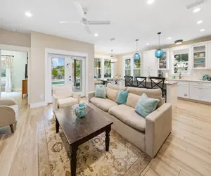Private French doors open to a secluded outdoor living space from the king master suite. Soft outdoor furniture underneath a private pergola awaits guests staying in this suite, along with a private ensuite featuring double vanities, a smooth soaking tub and a walk-in shower. A furnished queen bedroom, which shares a full-sized bathroom with the twin bunkroom, boat bed, and twin trundle. The full-sized laundry room is such a welcome convenience when staying several days, just throw the wet bathing suits in the dryer and continue enjoying your vacation.