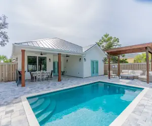 Just 2 blocks from the emerald waters of Panama City Beach Florida is “Bid-A-Wee Beach Bungalow.” A recently custom-built home, perfectly designed and fully equipped for a vacationer's dream! Featuring 3 bedrooms, a fully equipped kitchen, multiple outdoor lounge areas, and a relaxing (heatable*) pool – this vacation rental was made to exceed 5-star expectations! In addition to its private beach access, modern furnishings & coastal décor, its spacious private backyard is what brings guests back to visit each year! Poolside lounging, island-style dining and nighttime bonfires are just a few of the sought-after vacation-style amenities at Bid-A-Wee Beach Bungalow.