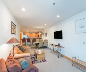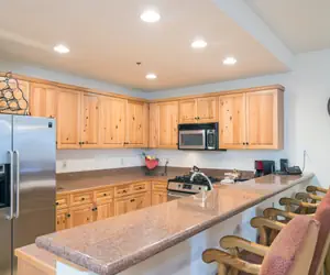 Enter this condo on the fitness room level (first floor) and walk into the open dining area with seating for six guests and living room with a gas fireplace, balcony facing the mountainside (forest view) and a queen sleeper sofa. The living room is open to the kitchen with granite countertops and a breakfast bar with seating.
