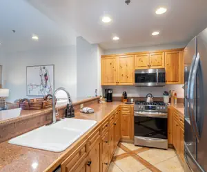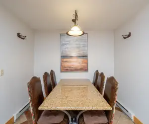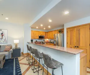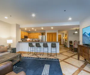 Enter this condo from the second floor and walk into the open dining area and living room with a gas fireplace, balcony facing the mountainside (forest view) and queen sleeper sofa. The living room is open to the kitchen with granite counter-tops and a breakfast bar with seating.
