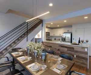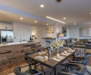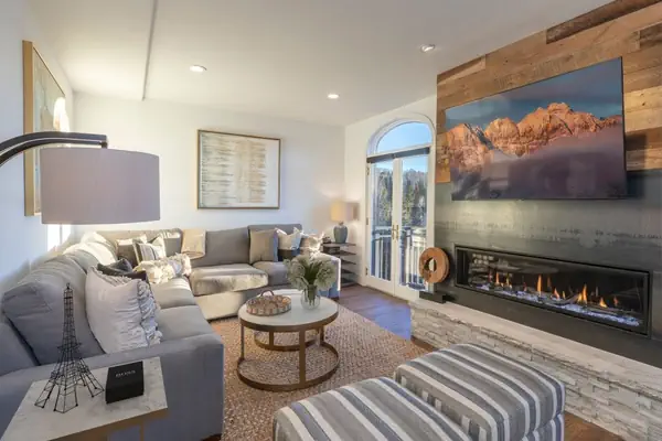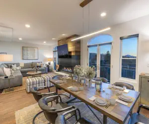 Guests enter this condo from an exterior walkway on the fourth floor (elevator access) of the Bear Creek Lodge. Upon entering this home, guests are welcomed into a large, open family room complete with a living room, dining room and kitchen. The living room is highlighted by a sleek modern gas fireplace that is flanked by two double doors leading to an amazing outdoor patio with sunset views. Guests can enjoy the comfortable sectional couch, flat screen TV and amazing views.