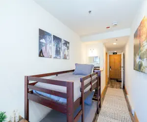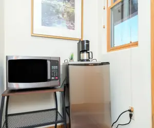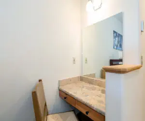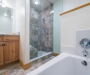 Guests enter this unit on the third floor (lobby level) and are welcomed into a bright and airy hotel room-style lock-off room. The room features a king bed, twin bunk bed, small vanity area, flat screen TV, coffee maker, microwave and mini-fridge. The en suite bathroom has a step-in shower with a glass enclosure and a jetted tub. Every unit at the Bear Creek Lodge includes a fan, humidifier, hairdryer, coffee maker, starter coffee, and robes.