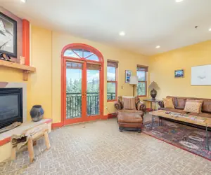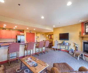 Enter this condo on the lobby level (third floor) and walk into the open dining area with seating for six guests and living room with a gas fireplace, balcony facing the mountainside (forest view). The living room is open to the kitchen with granite countertops and a breakfast bar with seating.