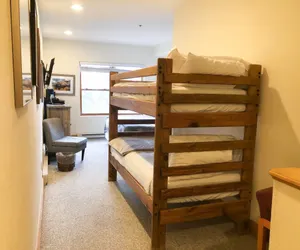 Guests enter this lock-off hotel room from the second floor of the Bear Creek Lodge. The main room has a king bed and twin bunk bed, flat screen TV, small vanity area, and a microwave, mini-fridge and coffee maker. The en suite bathroom has a separate jetted tub and step-in shower. Every unit at the Bear Creek Lodge includes a fan, humidifier, hairdryer, coffee maker, starter coffee, and robes.