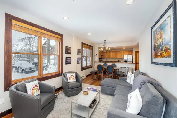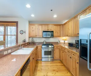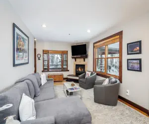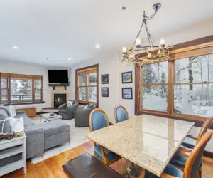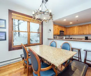 • Enter this condo on the fitness room level (first floor) and walk into the open dining area with seating for six guests and living room with a gas fireplace, some mountain views and a queen sleeper sofa. The sofa bed has a built-in air-mattress topper as a mattress. The living room is open to the kitchen, which has granite countertops and a breakfast bar with seating.