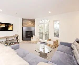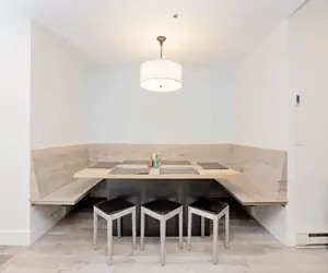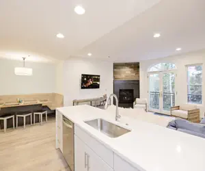 Enter this condo on the fourth floor and walk into the completely modern and open dining area and living room with a gas fireplace, flat screen TV, and balcony facing the mountainside (forest view). The living room is open to the kitchen with granite countertops and large, stylish sectional sofa.