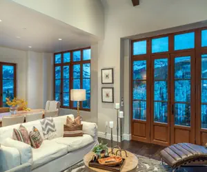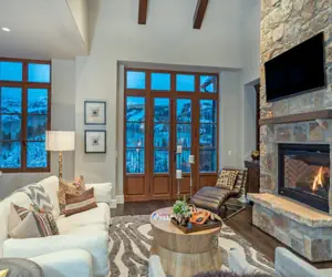 This home is accessible via the elevator and is located on the fifth floor of the Villas at Cortina. Upon entering this condo, guests are welcomed into a large living room space with vaulted ceilings showcasing the western views and a gas fireplace. A small outdoor terrace is also accessible from this room.