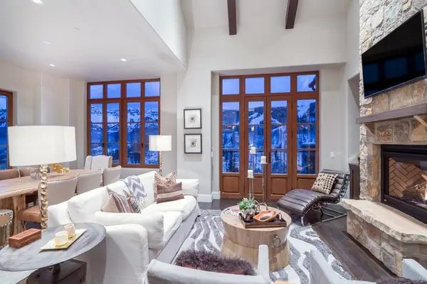 The living space is open to the dining room, which has panoramic views of the surrounding peaks. The light, airy space has a large dining table that seats up to eight people. Adjacent is the kitchen, which has expansive counter space, Wolf and Sub-Zero appliances and a small breakfast bar that seats two.