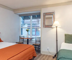 This kitchenette room provides you with a two-burner cooktop, mini-fridge, microwave, toaster, coffee-maker, and the pans and dishes you need to complete any meal. The queen bed and twin bed are all in the same room. The bathroom has a large exterior vanity area and a step-in shower.