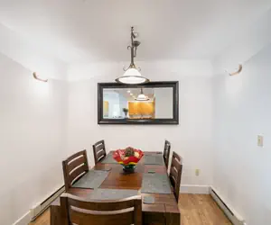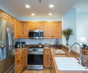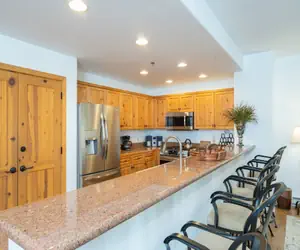 Enter this condo on the second floor and walk into the open dining area with seating for six guests and living room with a gas fireplace, balcony facing the mountainside (forest view) and a queen sleeper sofa. The living room is open to the kitchen, which has granite countertops and a breakfast bar with seating.