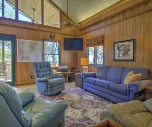 The master bedroom includes a king-size bed and a private bath, creating a peaceful haven after a day on the water or exploring the island. The additional two bedrooms provide comfort and flexibility for guests, while the second full bath is conveniently located for easy access.
