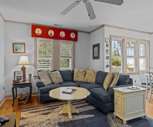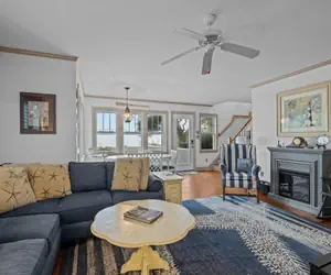 The interior of this home is as charming as the exterior is inviting. The floors are the original pine, the walls are lined with sunlit windows, and the tone is overwhelmingly peaceful. The living space is spacious yet cozy and open to the kitchen, which features blue cabinets, quartz counters, and a white farmer’s sink. There are two bedrooms downstairs, one with a queen bed, the other with three twins, perfect for the whole family. Upstairs is the primary bedroom suite. Enjoy privacy and stunning views, from watching the sunset over the water to marveling at the brilliant array of stars in the night sky.