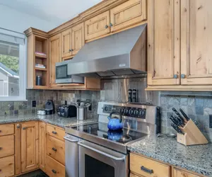 The fully stocked kitchen is a chef’s delight, outfitted with quality knives, gadgets, and spices to make meal prep easy and enjoyable. The adjacent dining area offers ample seating to bring everyone together for home-cooked meals or casual snacks.
