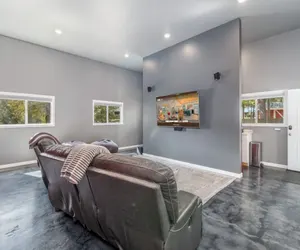 Recharge by the River is a modern retreat, featuring a sport court, private hot tub, and fenced yard. Perfect for families and adventure seekers, this three-bedroom haven offers everything you need for a relaxing and active getaway. Enjoy the nearby river activities, cook in the fully-equipped kitchen, or unwind in the living room by the fire. With pets welcome, this home is your ideal base for exploring the mountain charm of Leavenworth and the surrounding areas.