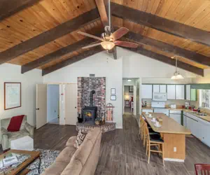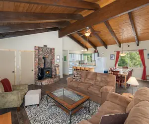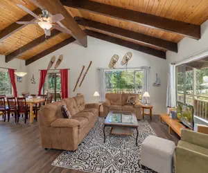 The home’s split-level design offers versatile gathering areas for groups or families. On the lower level, enjoy a casual family room with a wood stove and cozy seating. Upstairs, the open-concept living area includes a second wood stove, a plush lounge space, and access to the covered front deck for morning coffee or evening barbecues.