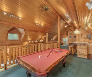 • Open Loft: Queen log bed, bar top w/ stools, and full-sized pool table