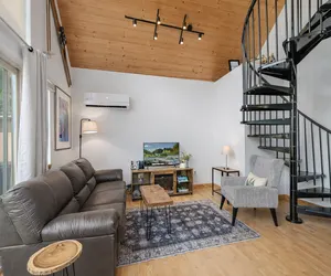 • Cozy seating and a spiral staircase leading to the loft