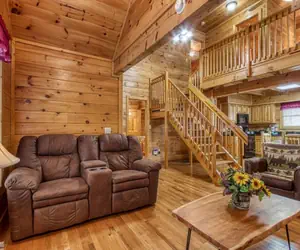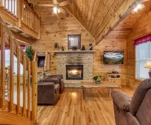 Point of View is an upscale two-level log cabin with two bedrooms, a lofted bedroom, and two bathrooms. It is located in a beautiful wooded setting in a log cabin community.