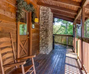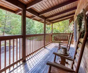 For those looking for relaxation to enjoy the natural peaceful setting, the cabin offers a covered front main level deck with a wooden swing and two wooden rockers. There is also a covered screened deck area that offers a patio set for six, five patio chairs, ceiling fan, and gas grill.