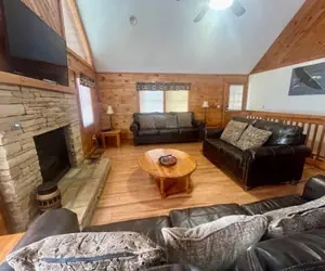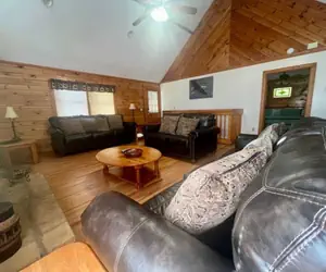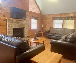 As you enter the main level, you will find a cozy living room area that offers 3 sofas, gas fireplace, TV, ceiling fan, and wood floor. The fully equipped kitchen is also located on this level with a table that will seat 6-8 with the bench and has everything needed to enjoy tasty meals at the cabin!