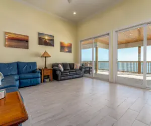 As you step inside, you’ll be greeted by an open living space featuring a fully equipped modern kitchen with two full sized refrigerators with ice makers in each. There is a large island for seating, a dining room conveniently situated next to the kitchen and a wine bar with a drink refrigerator and a stand alone ice maker. The spacious living room offers a large flat screen TV and direct access to the elevated back porch, where you can bask in the breathtaking Gulf views.