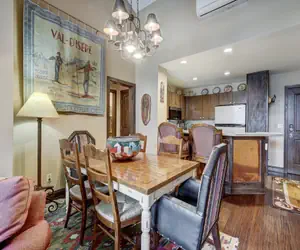 This two-bedroom, two-bathroom vacation home is thoughtfully decorated with tasteful mountain décor and cozy furnishings and offers excellent amenities and stunning Rocky Mountain views.