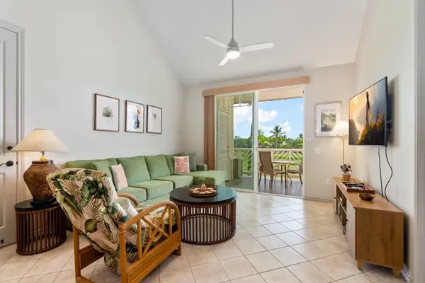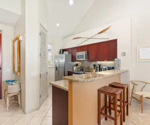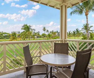Upon entry, you notice the open layout of this townhome. The kitchen flows to the living area, and your sliding doors open to a private lanai where you can look right out onto a golf course at Waikoloa Beach.