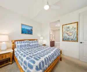 The guest room downstairs has a queen-size bed and a lovely Hawaii feel. Unpack in the closet or chested drawers. Relax and watch a show on the smart television. The guest bathroom is in the hallway and has a shower, bathtub combo.
