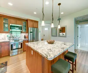 14-J is a garden-level, single-floor spacious vacation villa with a fully appointed granite and stainless steel kitchen, tons of counter space, a huge central island with casual counter seating, and tons of storage for your groceries. NO STEPS! The easy walk-out lanai opens directly to a verdant lawn bordered by tropical flower beds. Beach chairs and other accoutrements are in their own locker near the front entrance of the unit for easy access as you load up for the day's adventures.