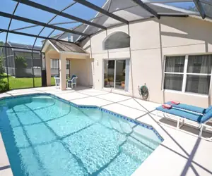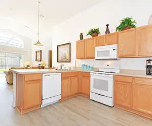 The kitchen is open plan and fully equipped. It looks onto the breakfast area and family room so the chefs in the kitchen can join in the fun! The family room has comfortable sofas to sit back and relax on while watching the flat screen tv or the kids having fun in the pool.
