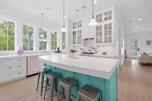 - A spectacular kitchen, designed by a Le Cordon Blue-trained chef, with pink Northstar retro appliances and a huge, strikingly white island, form the heart of the home.