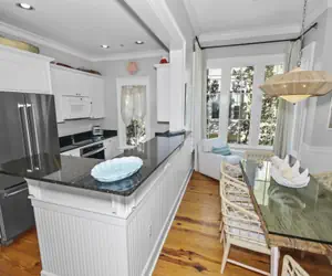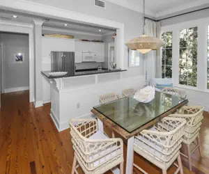• The dining room features a table with seating for 4 and 2 bar stools at the breakfast bar