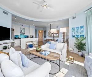When you walk down the hallway into the open concept living space, your eyes will be drawn to the large, rotunda windows with views over the dunes and out to the gulf. You will spend hours looking at this gorgeous view and watching the sunset each night. The property is decorated in creamy whites and shades of blue and provides an atmosphere of complete relaxation.