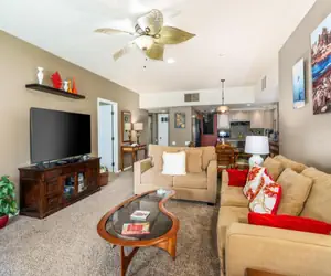 Upon entry, you are welcomed by an open layout of the dining area, living space, and kitchen. You can stream your favorite on the large flat-screen television and enjoy the central air conditioning. There is plenty of seating in the living area.