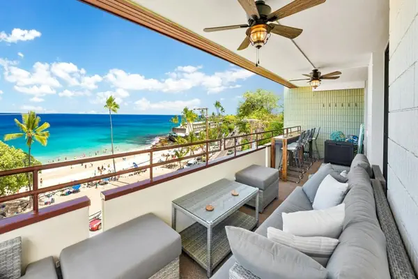 You will enjoy the nooks of this home and the spaces to relax with a book or watch the palm trees sway. The wrap-around, direct ocean-view lanai has ample seating with great spots to chill. Sit outside at the bar seats, make a mai tai, and watch the locals catch the waves at Magic Sands Beach or sit in the papasan and feel like you transported to paradise.