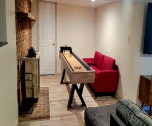 The home's thoughtful layout includes three main-level bedrooms, each with a queen bed and its own smart TV, while the primary suite adds a private en-suite bath for extra comfort. Downstairs, the fourth bedroom features two twin beds and an attached full bath — ideal for kids or friends. The lower-level family room offers more space to spread out, complete with two sofas (one a sleeper), a 70-inch smart TV, and a shuffleboard table for friendly competition.