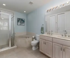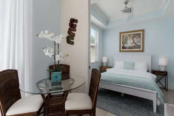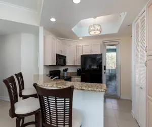 On arrival, there is off-street parking. Enter into the furnished foyer and open-plan kitchen, dining, and living areas. There is cool tile flooring throughout. The fully equipped kitchen has plenty of granite counter space and cabinets stocked with all the necessary items to prepare full-course meals if so desired. Appliances include a refrigerator/freezer with a pull-out freezer drawer with an ice maker, a 5-burner glass top range and convection oven, a built-in above-range microwave oven, and a dishwasher. There is a European-style sink with a disposal and even a Keurig coffee maker! A peninsular bar from the kitchen has three high-boy bar seats on the living/dining side. This flows into the well-furnished living area with a sofa and matching loveseat and coffee table on an area rug. Opposite this is a credenza with a large flat-screen TV. There is a table seating three. Sliding glass doors lead out to a balcony furnished with a cafe table and two chairs. The master bedroom with en suite bath has a king-size bed on an area rug, nightstands and lamps, a bench, a corner chair, and a triple dresser with a flat-screen TV. The bathroom has a single-piece vanity with dual lavatories and storage space beneath, a commode, a walk-in closet, a corner garden tub, and a walk-in shower with a glass wall and door. The guest bedroom is accessed through double pocket doors and is furnished with a queen-size bed, nightstands, and lamps. There is ample closet space, and access from this bedroom into the guest bathroom that has a single-piece vanity with lavatory and storage space beneath, commode, and combination tub/shower. Off the kitchen is a laundry room complete with a stacked washer, dryer, and laundry sink. Also, a door from the kitchen provides access out to the outdoor screened-in kitchen and seating area.