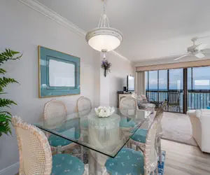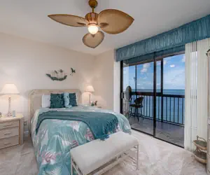 On arrival, there is a secure lobby and an elevator will whisk you to your ninth-floor condo. Enter into the open-plan kitchen, dining, and living areas. There is wood tile flooring in the main living area, tile in the bathroom, and carpeting in the bedrooms. The decor is a beachy motif. The large kitchen has plenty of granite counter space with tile backsplash and cabinets with all the necessary items to prepare full course meals if so desired, or simply toast and coffee in the morning made with your own Keurig coffee maker. Just bring the food! Appliances include a dishwasher, a 5-burner glass top range with a self-cleaning oven, a built-in above-range microwave oven, and a refrigerator/freezer with a pull-out freezer drawer with an ice maker. There is a peninsular L-shaped bar with two high-boy chairs on the dining area side. The adjacent dining room has a glass-top table seating six on an area rug. This flows into the living area which has a leather sleeper sofa with matching loveseat, end tables, lamps, and a coffee table on an area rug. Opposite the seating area is a credenza with a large flat-screen TV and two side chairs. Expansive sliding glass doors lead out to the furnished full-length balcony with a view from a ninth-floor vantage point that spans 180 degrees from Sanibel Island to Naples.