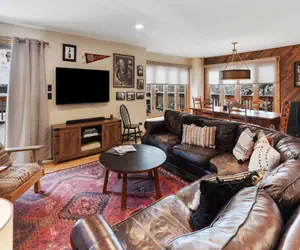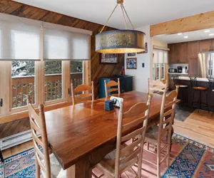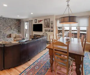• The kitchen is connected to the dining room that has seating for up to 6 at the large dining table. The open layout of the main level connects these areas to the living room. Cuddle up on the large wrap around couch for some quality time after a fun day in Steamboat.