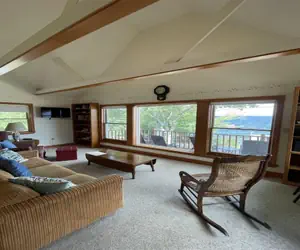 Desirable Ward's Cove location! What a view from this well maintained and equipped home overlooking private waterfront and dock which is located right across the camp road. Nice, bright open living/kitchen/dining area with huge windows providing a wide open lake view.