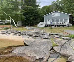Rustic shorefront cottage with a small sandy beach. Nice location with deck along the lakeside. Firepit at shore. First floor bedroom, bath with shower and open sleeping area on second floor with 3 double beds. Lovely views of the lake. Camp has been in the family for over 80 years. No Wifi or TV. Please note that the dock in the pictures doesn't belong to this property. 2 CARS ONLY.