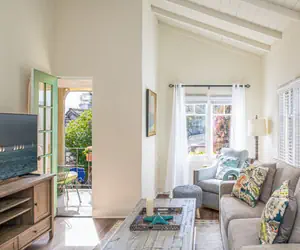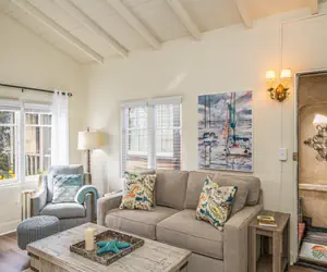 Hardwood floors, whitewashed vaulted ceilings, and handcrafted plaster walls are among the attractive features, as well as vintage built-in cabinets that provide plenty of storage space. A color scheme in soothing tones of white, gray and blue reflect the nearby ocean environment, and eclectic décor captures the creative spirit of Carmel.