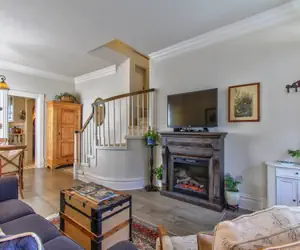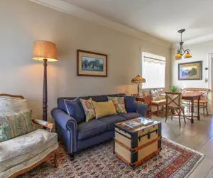 Guests enter the home via a short flight of stairs to the porch, where the front door opens into the cozy living room, with comfortable seating around an electric fireplace and hand-scraped hardwood floors. It’s a perfect spot to watch the 42-inch HDTV and enjoy conversation or a good book. Adjacent to the living room is an antique wooden dining room table with seating for 6.