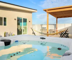Sun Oro is a brand new build and masterfully designed home surrounded by lush desert landscape. This brand new home is filled with a stunning interior design for relaxing in luxury. Our guests can enjoy dinner with friends at the outdoor dining table, lounge by the outdoor fire pit, or end their night relaxing in the hot tub under the stars. We hope guests wake up relaxed, rejuvenated, and have a truly unique experience.