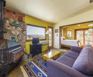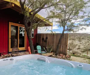 • As you enter the front gate, you will be greeted by the colors of the cabin and magic of the desert. There are private patios in the front and back, perfect for sunrise coffee and sunset cocktails. The 2 bedroom cabin (one king bed, one queen bed) has a fully equipped retro kitchen. Each room offers perfect views of the vast desert landscape, and abundant natural light. The cabin sits on 10 beautiful acres, with vast view from every angle and comfortable outdoor seating for a night of relaxing and star gazing.