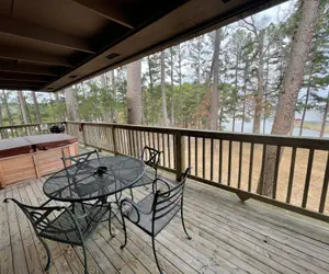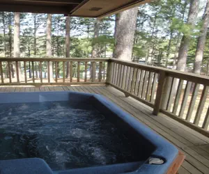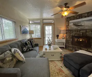 This beautiful two bedroom, two bath cottage has everything you need to feel welcome! There is a king bed in the master and two queens in the guest bedroom. A fully equipped kitchen, location right next to the swimming pool and restaurant and spacious lake view deck with hot tub make this one of our most popular units! This unit also has and it also has TV's in living room and both bedrooms.