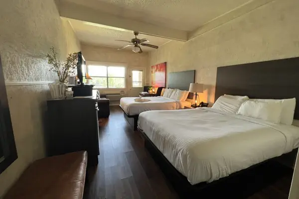 Our Lodge Queen Guest Room has two queen beds and a queen sleeper sofa.